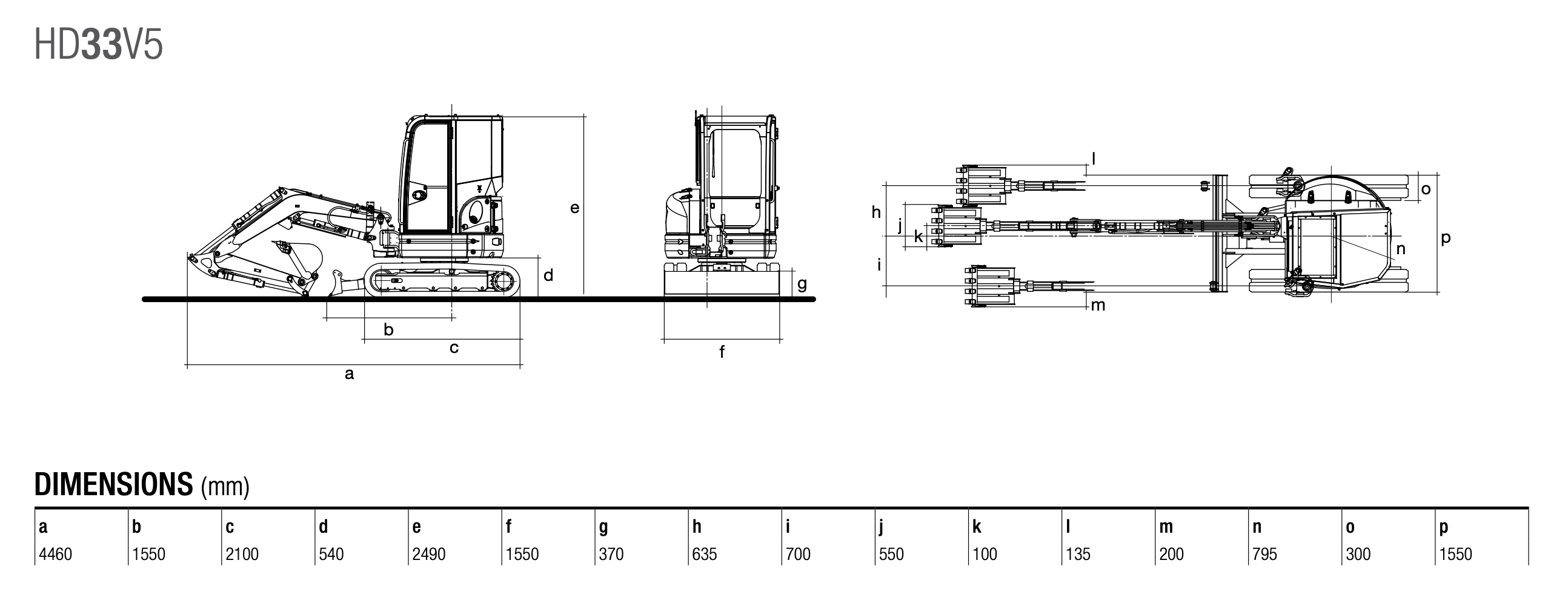 Експлуатаційна вага моделі HD33V5 становить 3245 кг у версії з кабіною та 3095 кг у версії з навісом. Стандартна конфігурація включає передній відвал 1550 мм і ковш 550 мм.