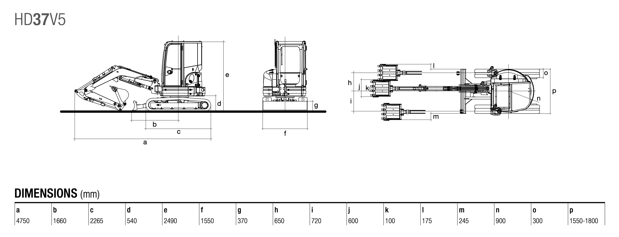 Експлуатаційна маса моделі HD37V5 складає 3675 кг у версії з кабіною та 3525 кг у версії з навісом. Стандартна конфігурація включає бульдозерний відвал 1550 мм та ківш 600 мм.