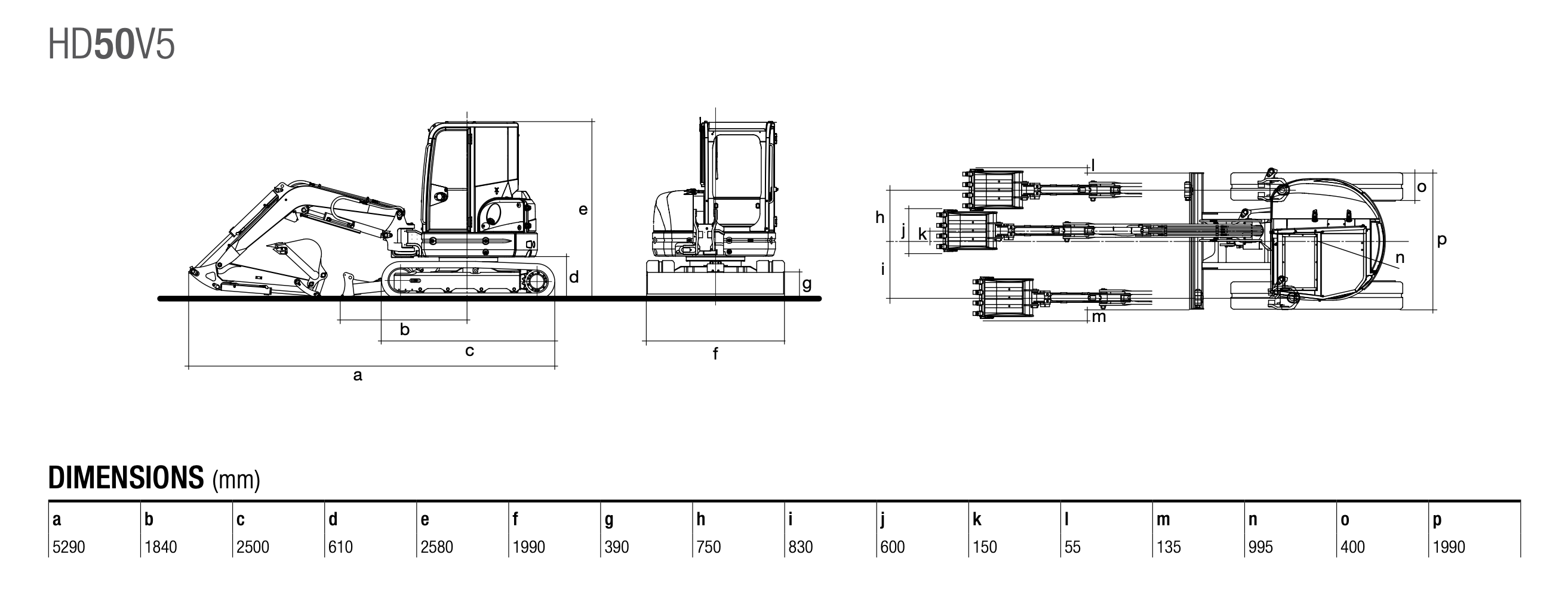 Експлуатаційна маса моделі HD50V5 становить 4875 кг у версії з кабіною. У стандартній комплектації відвал 1990 мм і ковш 600 мм.