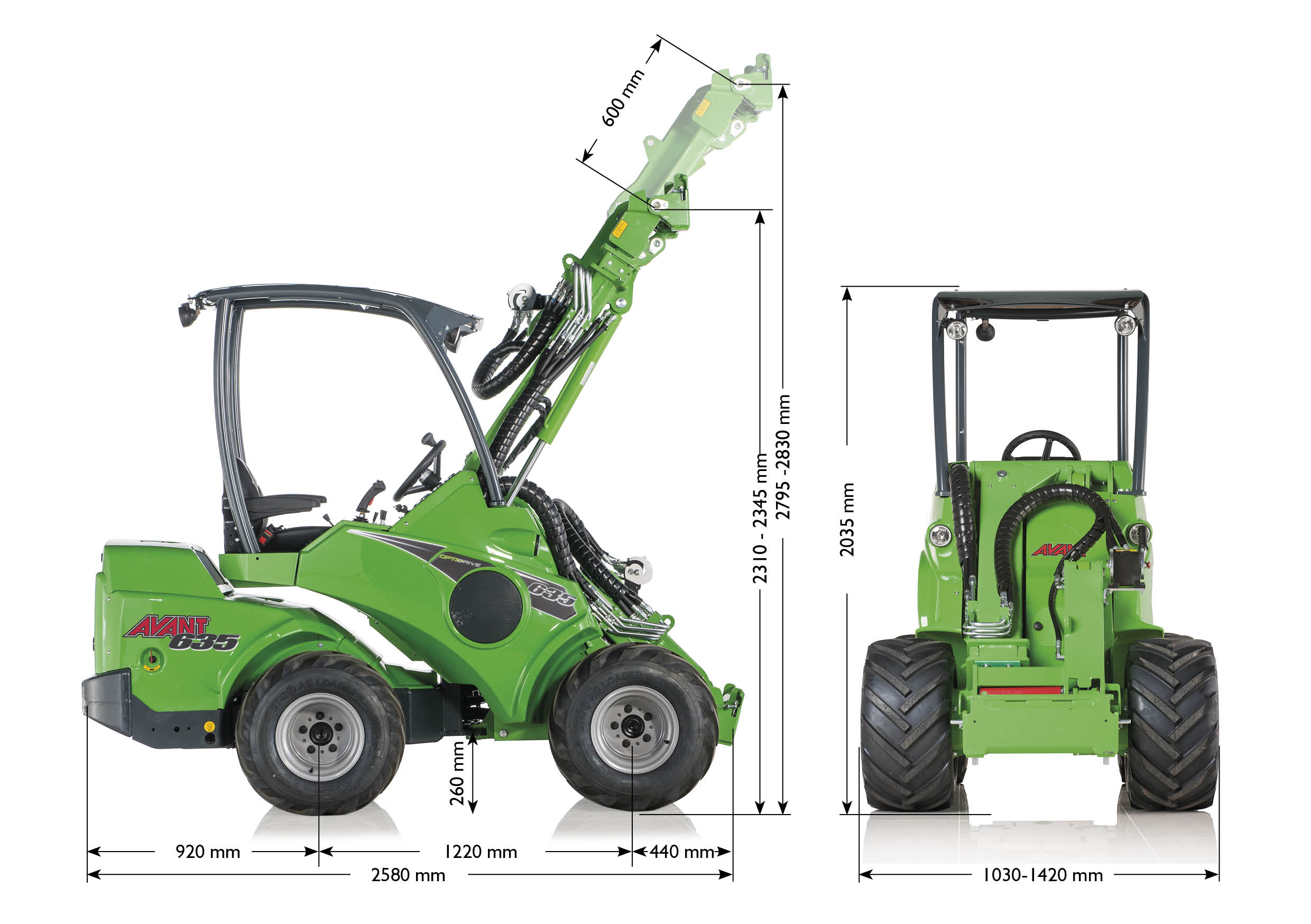 Поєднує потужність, вантажопідйомність та професійну гідравліку, які знаходяться в дуже компактній машині. Це робить AVANT 635 дуже популярною машиною для багатьох професіоналів у ландшафтному дизайні, будівництві, садівництві, конюшнях та багатьох інших галузей. Макс. вантажопідйомність 1 тонни ідеально підходить для безлічі робіт, а потужна допоміжна гідравліка працює майже з усім навісним обладнанням Avant.