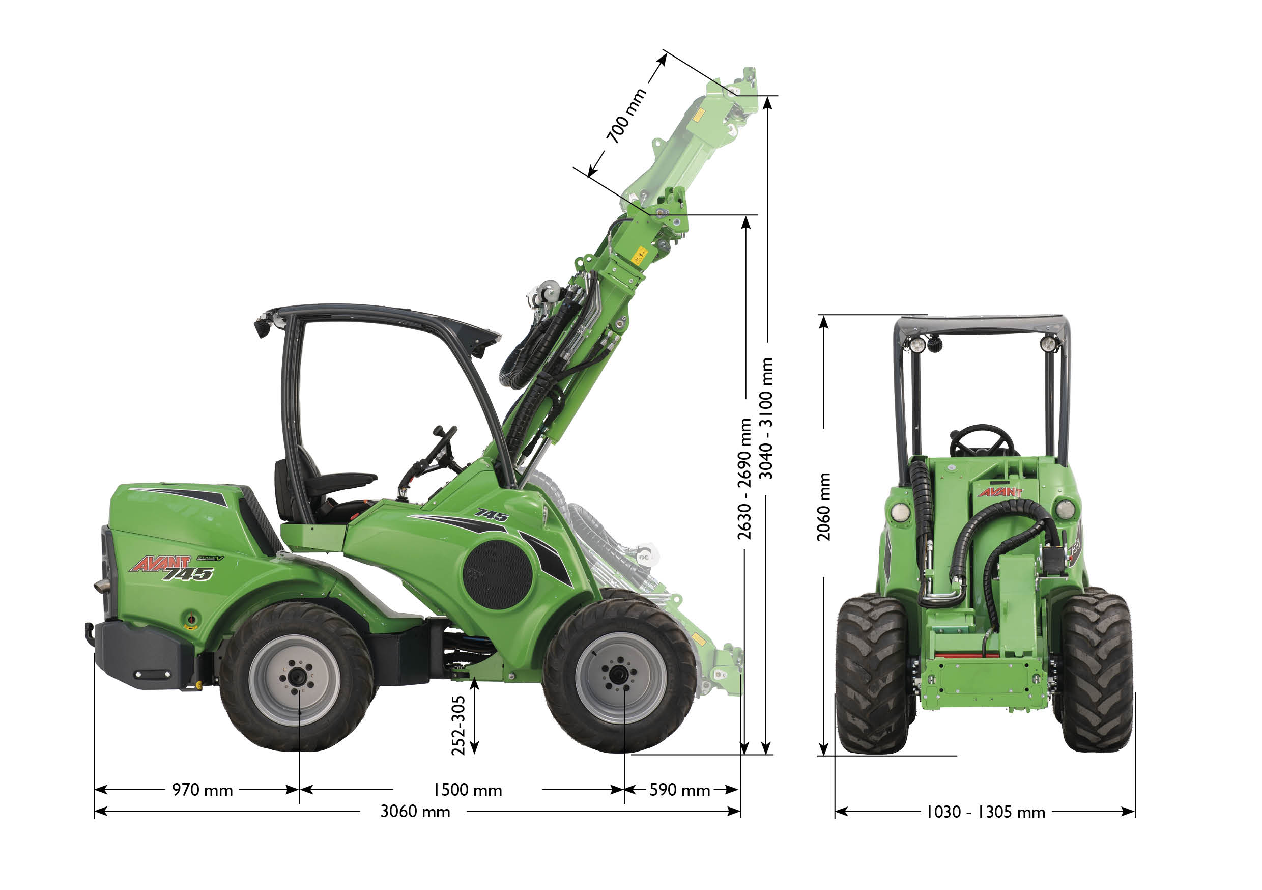 AVANT 745 потужний та справжній багатофункціональній навантажувач для роботи, де потрібна висока вантажопідйомність, але в той же час машина повинна бути максимально компактною. AVANT 745 є ідеальним інструментом для підйому та транспортуванню тюків та інших матеріалів на фермах, при роботі з бруківкою, переміщенням матеріалів на будівельних майданчиках та у багатьох інших сферах застосування.